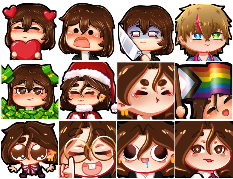 Stickers T2 & T3: + 5€For other pack sizes (emotes or badges), please contact me directly !(Emotes supplied in "224x224 / 112x112 / 56x56 / 28x28 px" formats. Badges in "114x114 / 72x72 / 36x36 / 18x18 px" formats)